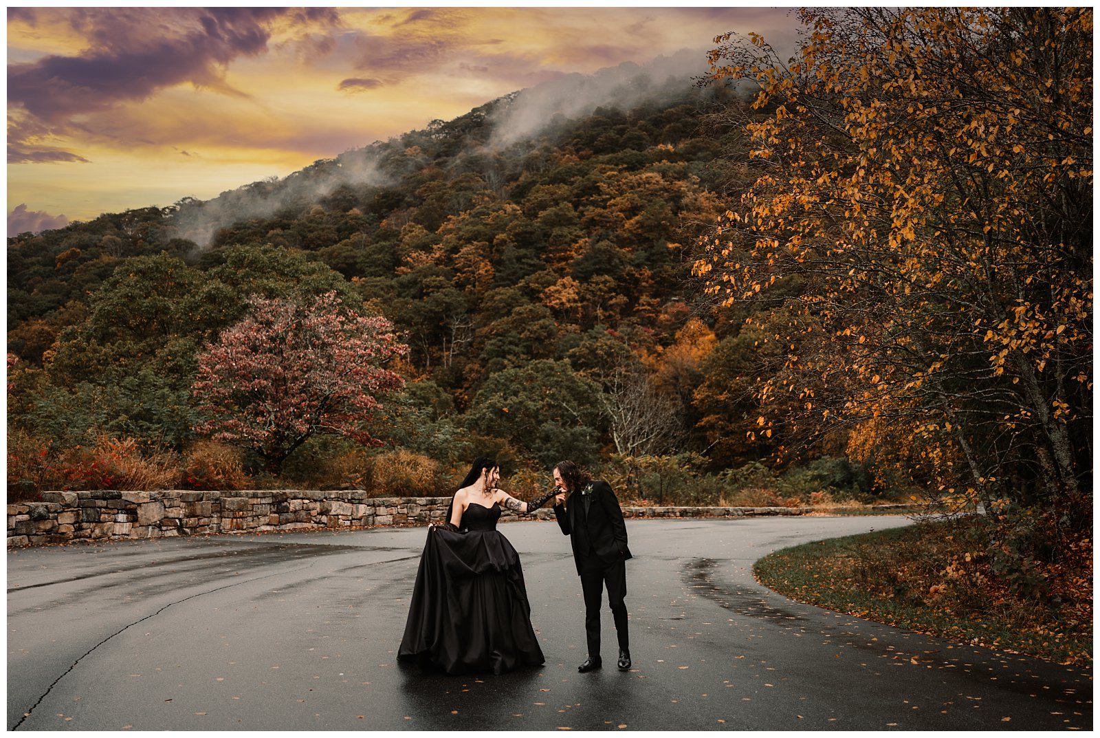 I remember being excited and amazed at Chayanne and Robert’s wedding planning meeting as our bride Chayanne unboxed her centerpiece items to try them out on the tables. It was evident at that moment that this wedding would be so unique and such fun to be a part of! If you are ready for something really wonderful and very different from the “traditional”, then have I got a sneak peek for you!!! Working on these photos, my cheeks hurt from smiling, it was such a happy day, so full of joy and really heartfelt moments. Days like this help me remember how good people can be, and make me appreciate the very special honor it is to share in someone’s wedding day. Stacks of black cloth bound books, dried flowers in earth tones, and the flicker of candles graced each guest table. Our bride’s color of choice was well represented in the dark and moody decor she provided for her wedding day. And her dress, well it was simply magical. And even the weather understood the assignment…a churned up sky of moody clouds and thick mist steadily rising from the valley floor to cloak the mountains in an air of mystery – we couldn’t have asked for anything more fitting. I could have photographed this lovely couple forever, so much fun and so kind and gentle. Let me waste no more time…it is time to unveil some favorite images from Chayanne and Robert’s delightfully dark wedding day…